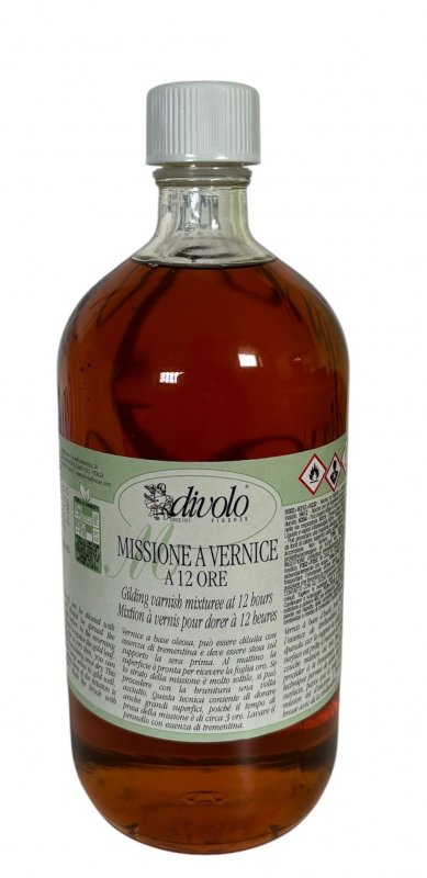 Divolo mixtion verguldlijm is een vernislijm op oliebasis voor het aanbrengen van bladgoud.12 uur droogtijd is het meest geschikt voor grote oppervlakken, buitenwerk, in een droog en stofvrij klimaat. Op basis van lijnolie & hars en loodvrij Droogtijd 12-15 uur. Kan worden verdund met terpentijn.