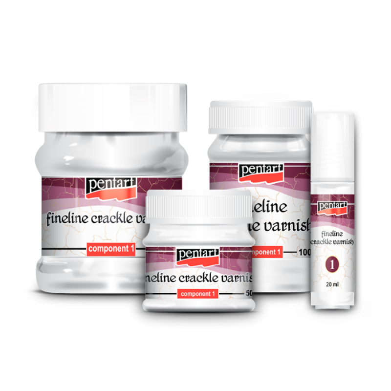 Pentart Fineline Crackle Varnish Set geeft uw projectoppervlakken het effect van prachtig oud, gekraakt porselein. Dit product bestaat uit 2 componenten in elke set, genummerd Component 1 en Component 2.. Component 2 is op basis van oplosmiddelen. Elke set wordt geleverd met een instructiefolder.