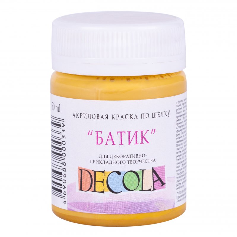 Farby do jedwabiu Decola to wysokiej jakości wodne farby akrylowe o płynnej konsystencji. Farby przeznaczone są do malowania na jedwabiu oraz na cienkich tkaninach naturalnych i syntetycznych. Po naniesieniu na materiał głęboko przenikają we włókna tkanin, nie usztywniając ich. Farby są szybkoschnące (1h - 1,5h). Utrwalić je można zaprasowując żelazkiem po lewej stronie tkaniny. Po zaprasowaniu można prać w temperaturze od 30 - 40 C°. Poj. 50 ml.