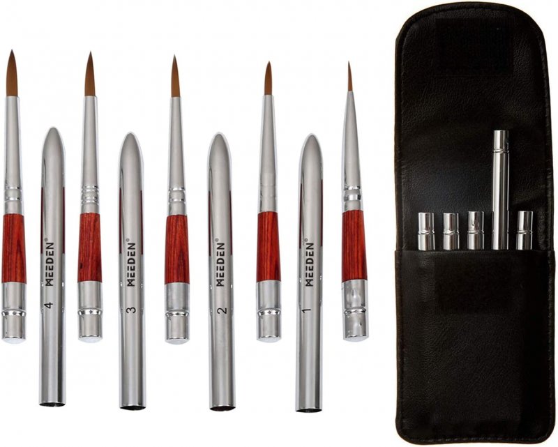 Zestaw 5 okrągłych pędzli syntetycznych Meeden wysokiej jakości. Włosie osadzone jest w niklowanych skuwkach. Obsadka jest częściowo drewniana a częściowo wykonana z nierdzewnego niklowanego metalu. Pędzele nr. 1, 2,3,4,5 są składane, tak aby krótszą część pędzla z włosiem, można było chować w metalowym module obsadki. Zestaw został opracowany dla malarzy plenerowych, akwarelistów, malarzy na jedwabiu i artystów, którzy pracują z tuszami, akrylami, gwaszem. Ten zestaw pięciu pędzli jest idealnym towarzyszem podróży. Pędzle po rozłożeniu mają ok. 18 cm. Złożone mieszczą się w mini etui skórzanym zapinanym na przylepiec, które jest na wyposażeniu zestawu.