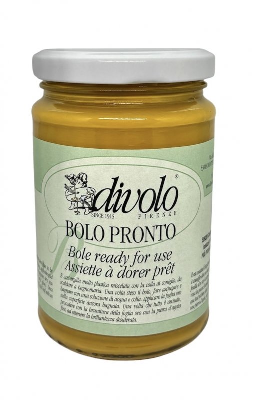 Ready-to-use gilder's clay mixed with rabbit-skin glue, to be heated in a double boiler. After application, apply the gold leaf on the surface while still wet (if the surface appears dry, you can wet it with a solution of water and glue). Once everything is dry, proceed to the polishing of gold leaf with an agate stone until you achieve the desired brightness.
